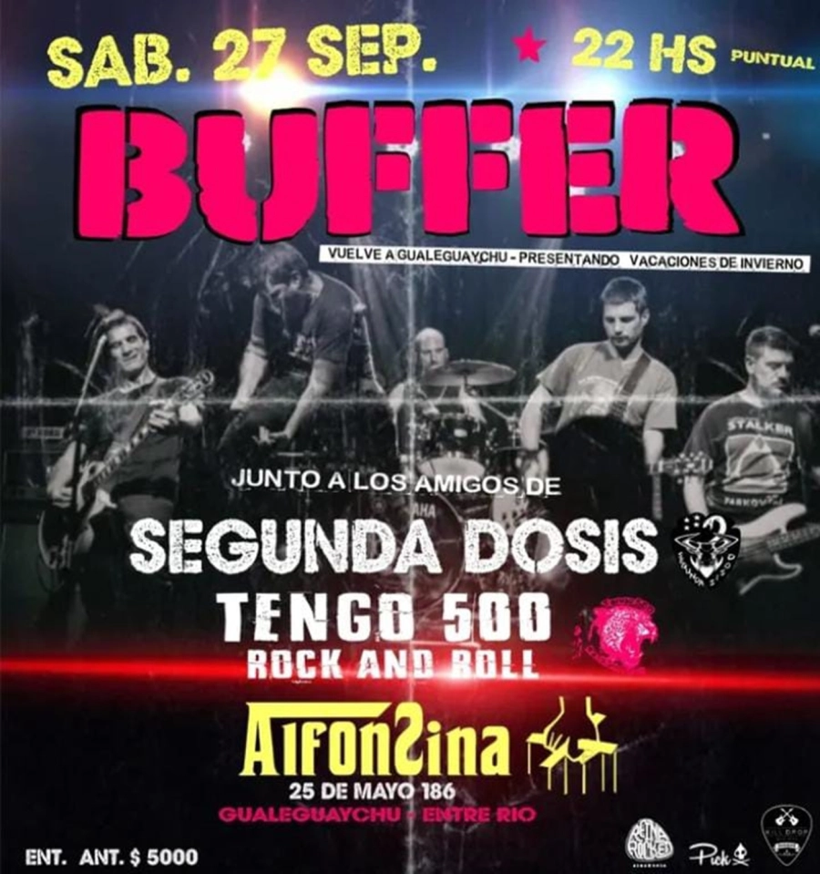 La banda de punk rock Buffer vuelve a Gualeguaychú para presentar su nuevo EP “Vacaciones de invierno”. Además, estarán acompañando las bandas invitadas Segunda Dosis y Tengo 500. Show apto para todo público, como siempre, en el templo del rock.