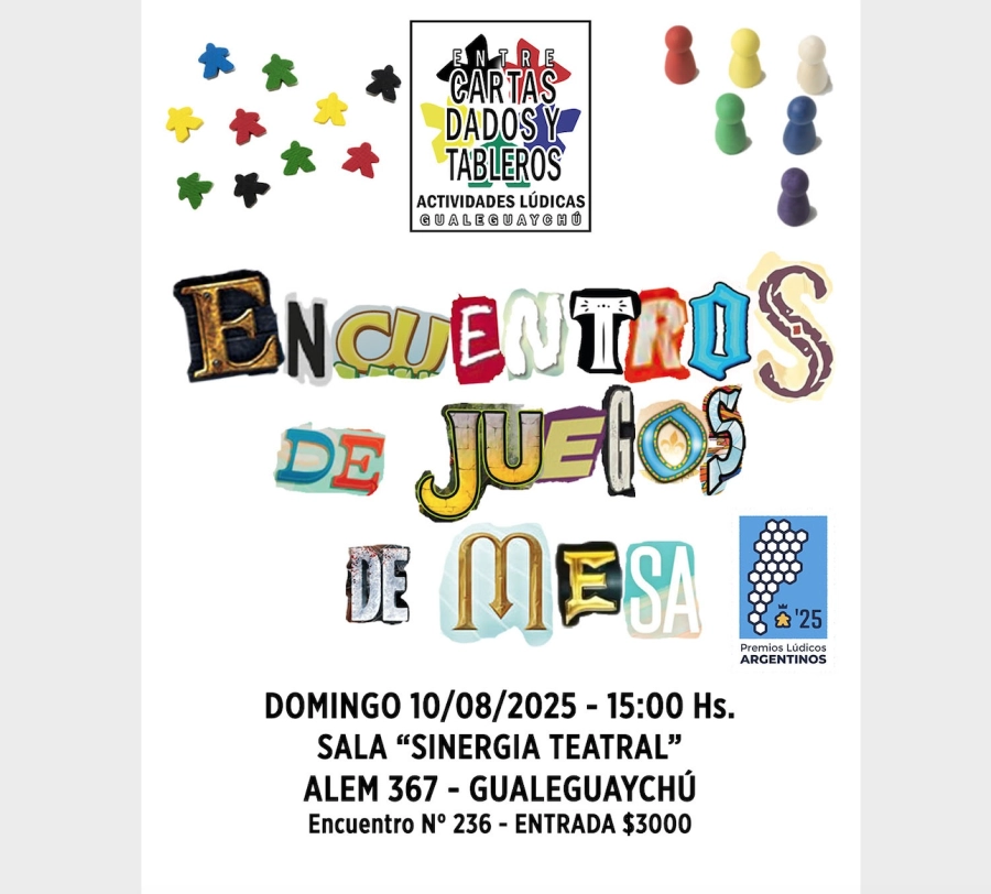 Sinergia Teatral te invita a disfrutar una tarde de juegos, de esas que ya son un clásico en Gualeguaychú. La propuesta incluye más de 200 juegos nacionales e internacionales. Un espacio para reencontrarse con gente querida, reír, compartir y mirarse a los ojos, juego mediante. Podes venir en grupo, solo o en pareja. Habrá servicio de cantina.