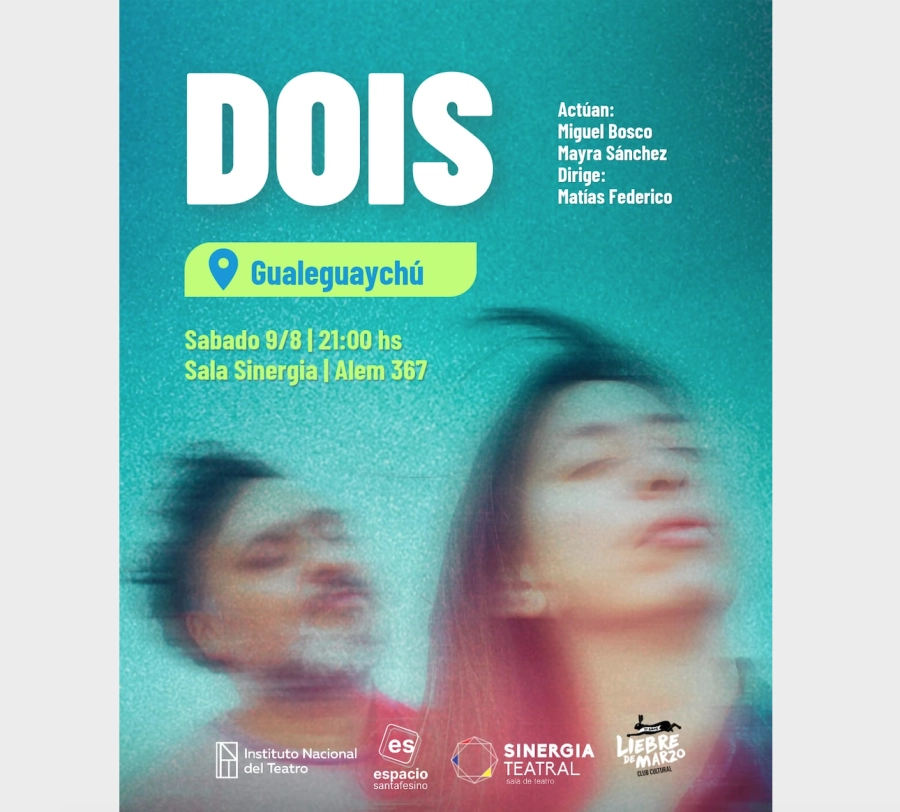 Sinergia te invita a conocer la historia de "Cachorro" y "Tata", dos que se necesitan. Están ahí, en el otro, olhando a noite. Una ola los lleva, los mueve, siguen ahí. Juntos. Dois es una pieza escénica que apuesta a la potencia de las actuaciones, en donde se explora la capacidad expresiva del idioma portugués, el cual permite desprender la actuación y la expectación de la lógica de sentido que ofrece la lengua y su discurso. Habilitando a indagar en nuevas corporalidades y gestualidades dramáticas. Obra seleccionada para participar del festival de teatro de Rafaela 2025. Obra seleccionada para participar del ciclo Co-Producciones de CEC (Rosario). Obra seleccionada para participar del ciclo "Territorios escenicos" (C.C.Borges-CABA). Obra seleccionada para participar en festival internacional de teatro Mercosur (Córdoba)