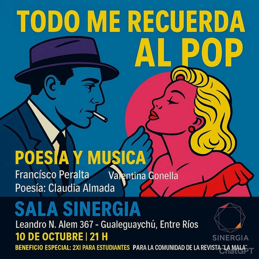 Un encuentro que combina letras y sonidos, abriendo paso a una experiencia pop para deleitar los sentidos. La música estará a cargo de Francisco Peralta y Valentina Gonella. Por su parte, Claudia Almada pondrá la poesía a una noche inolvidable. Beneficio especial: 2X1 para estudiantes y para la comunidad de la revista "La mala"