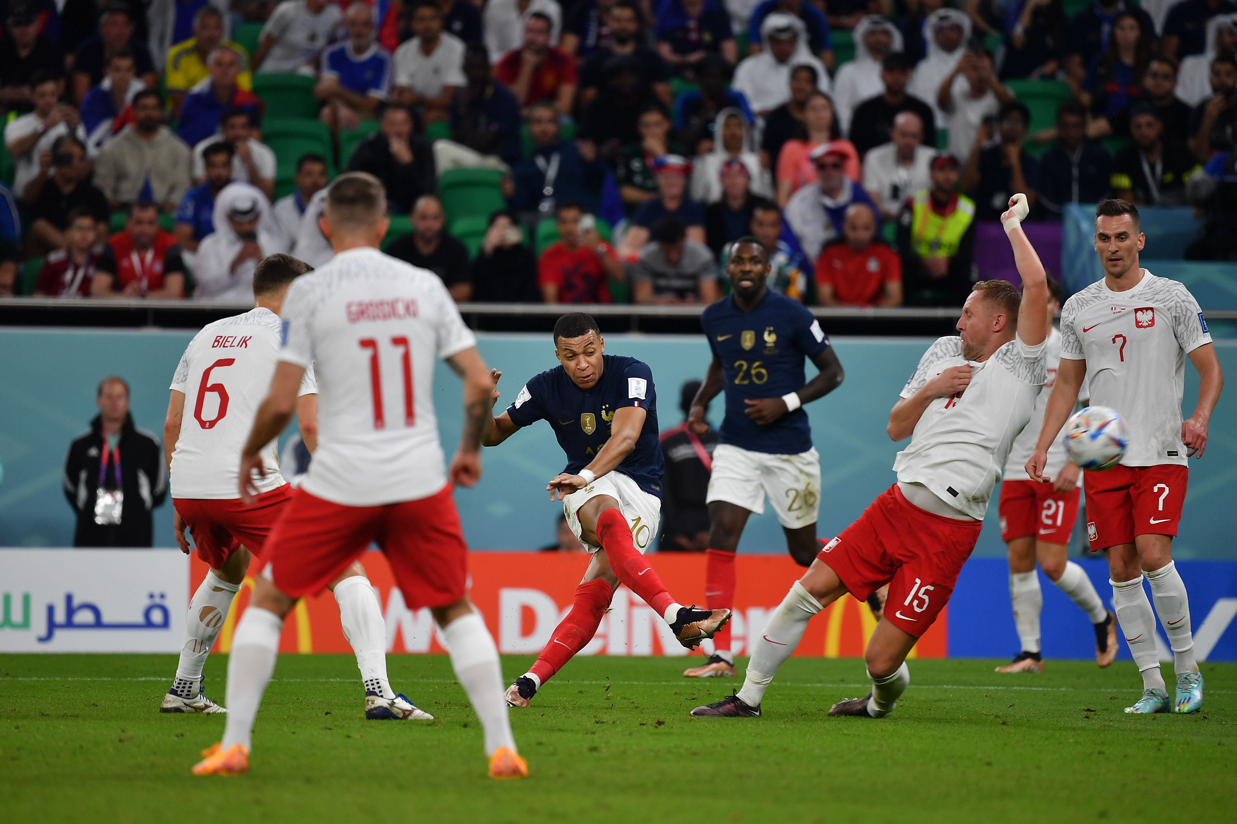 Cambios en el segundo tiempo, 19m. Arkadiusz Milik por Szymanski (P); 21m. Youssouf Fofana por Tchouameni (F); 26m. Nicola Zalewski por Kaminski y Krystian Bielik por Krychowiak (P); 31m. Kingsley Coman por Dembelé y Marcus Thuram por Giroud (F); 42m. Jan Bednarek por Kiwior y Kamil Grosicki por Frankowski (P); 47m. Axel Disasi por Kounde (F).