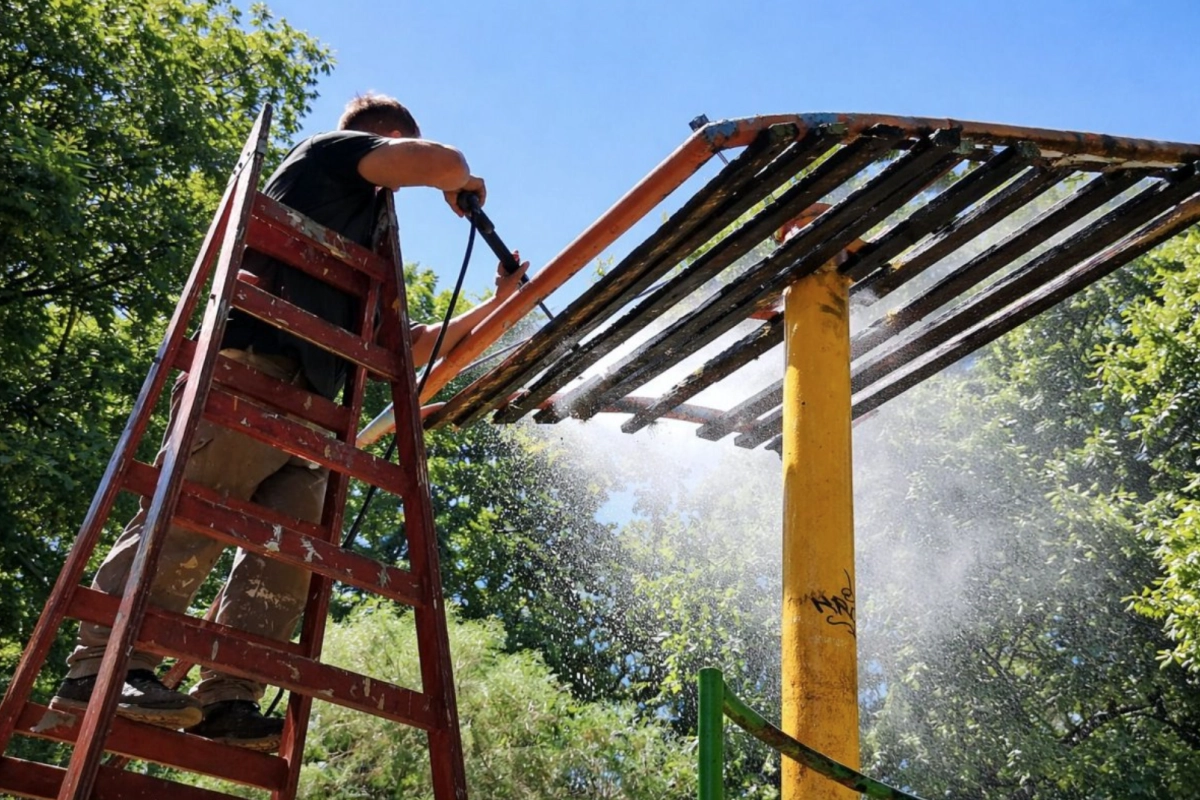 Entre los trabajos en ejecución se destacan las tareas de hidrolavado sobre los juegos infantiles con el objetivo de remover suciedad acumulada, restos orgánicos y agentes que afectan la durabilidad de los materiales.