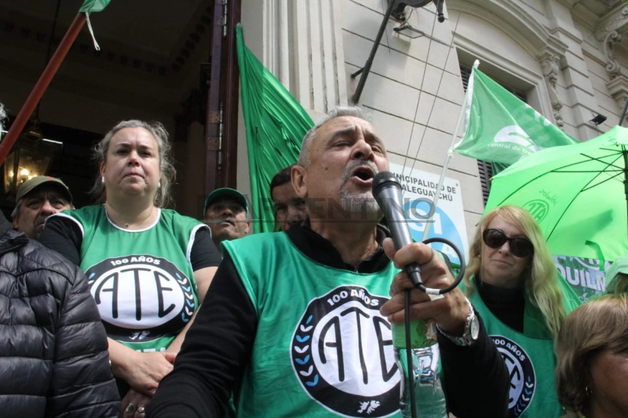 El secretario general de ATE Gualeguaychú, Alberto Mendoza, fue uno de los oradores más ovacionados de la jornada. Desde el escenario montado frente al Municipio, expresó: