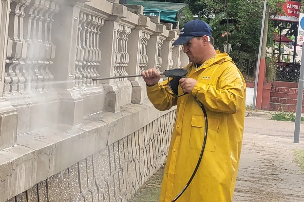 El Gobierno de Gualeguaychú, con la labor del personal de la Dirección de Higiene Urbana, ejecuta una limpieza integral de los paredones y las instalaciones que rodean la plaza Almeida (ex plaza Colón), la cual está delimitada por las calles y avenidas Morrogh Bernard, Del Valle, San Lorenzo y Concordia.