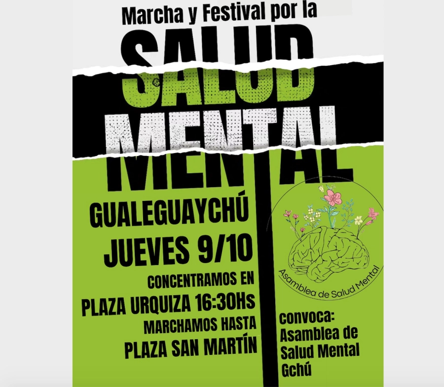 Este jueves 9 de octubre se realizará en Gualeguaychú una nueva jornada por el Día Mundial de la Salud Mental, organizada por la Asamblea de Salud Mental. La convocatoria incluye una marcha y un festival que se desarrollarán en la Plaza San Martín.