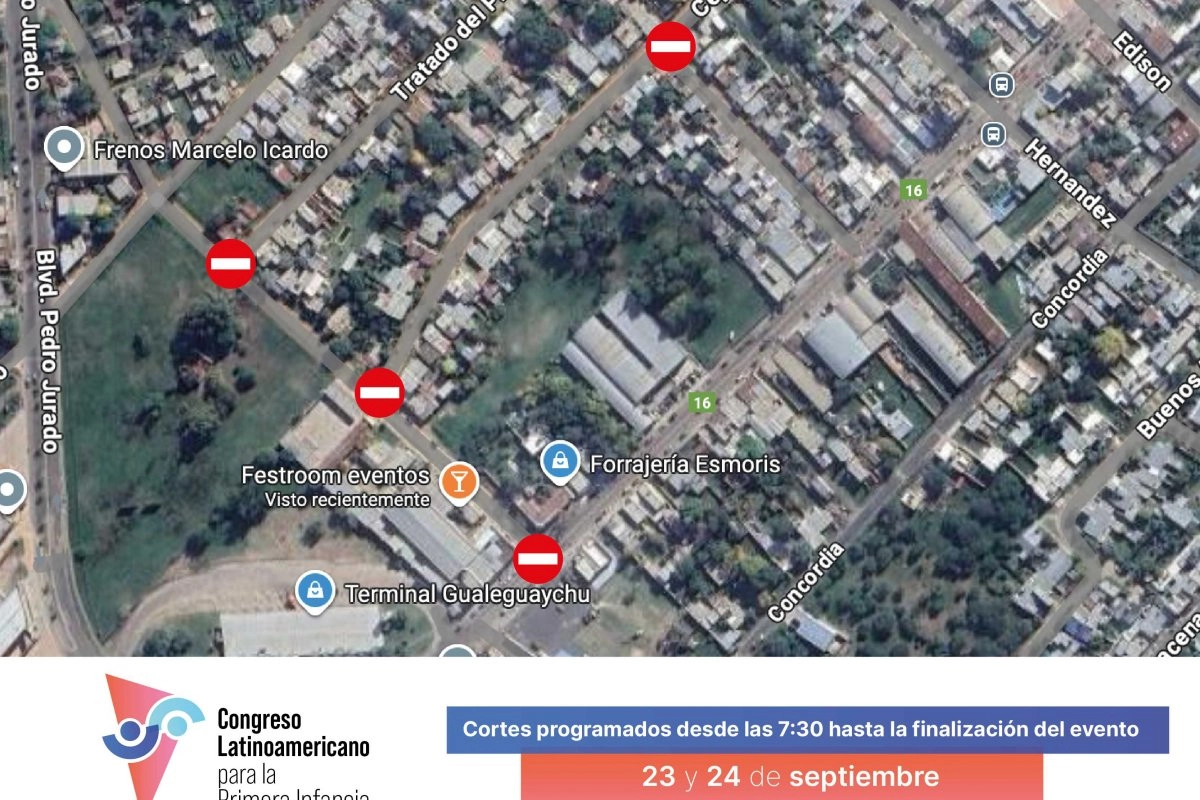 El Gobierno de Gualeguaychú informó que, con motivo de la realización del Congreso Latinoamericano para la Primera Infancia, se implementarán cortes y desvíos de tránsito en calles aledañas al Salón de Eventos Festroom (Bozzano 672), donde se desarrollará el encuentro.