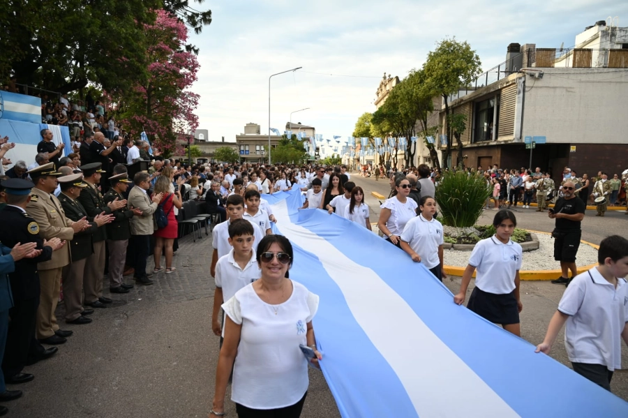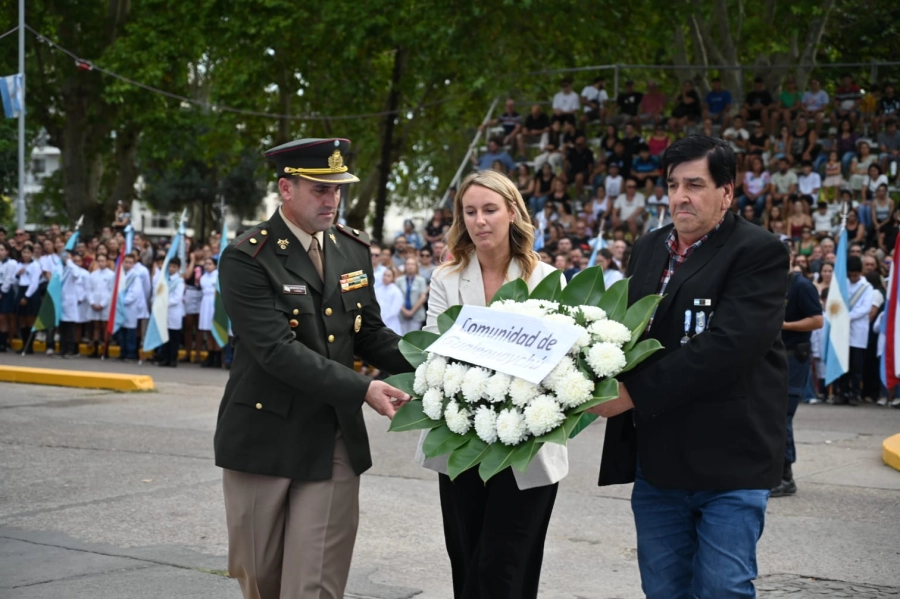 La ceremonia incluyó los momentos centrales del protocolo: izamiento de la bandera, entonación del Himno Nacional y la Marcha a Entre Ríos, interpretados por la Banda Militar “Teniente Coronel Saturnino Filomeno Verón”. También se colocaron ofrendas florales en homenaje a los caídos y se compartió un mensaje espiritual a cargo del sacerdote Oscar Bourlot.