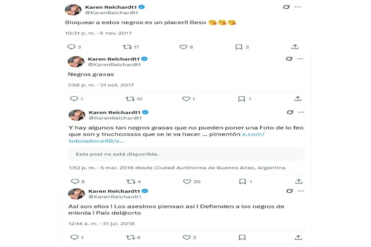 Los registros publicados por usuarios en X muestran una serie de publicaciones realizadas entre 2017 y 2018, en las que Reichardt utilizó expresiones como “negros grasas” o “bloquear a estos negros es un placer”, refiriéndose a hinchas de fútbol y otros usuarios. En otro mensaje, del 5 de marzo de 2018, ironizó con una imagen de los Reyes Magos en tono racista, reforzando estereotipos sobre personas afrodescendientes.