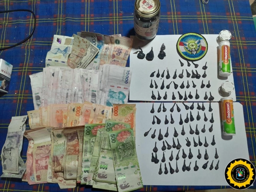 Dentro del inmueble, los funcionarios hallaron un punto activo de comercialización de estupefacientes. Allí se secuestraron entre 120 y 131 envoltorios de nylon con clorhidrato de cocaína ya fraccionada, con un peso aproximado de 50 gramos totales, listas para ser distribuidas al consumidor. También se incautaron entre $230.000 y $250.000 en efectivo, teléfonos celulares, un plato con restos de droga y recortes utilizados para el armado de las dosis.