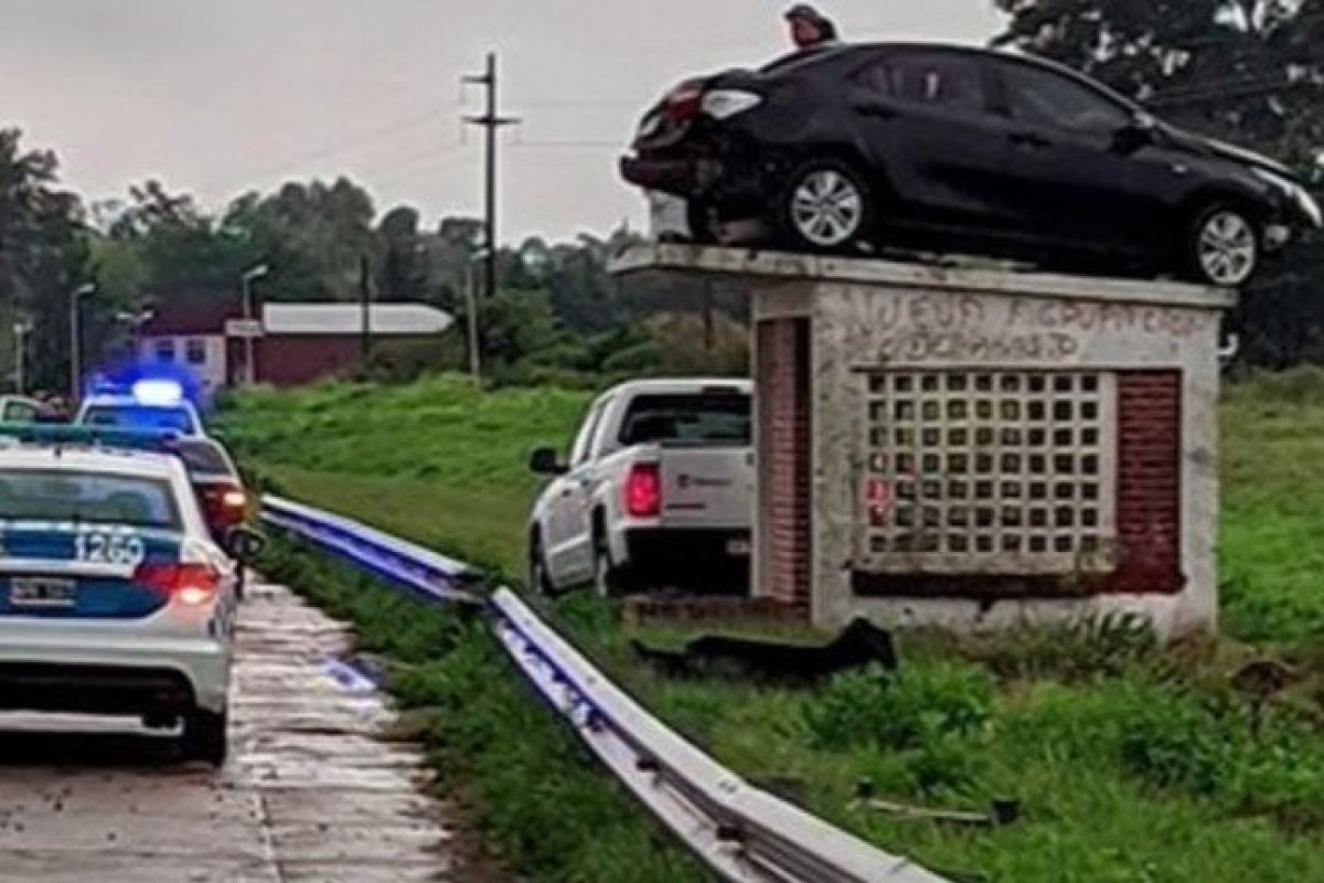 El siniestro ocurrió este domingo sobre la ruta 14, a la altura del ingreso a Colonia Hughes, en el departamento entrerriano de Colón. Y todo parece indicar que, a raíz de la lluvia, el auto derrapó por el asfalto mojado y el conductor perdió el control de su vehículo hasta dejarlo perfectamente estacionado en el techo de ese refugio para pasajeros, a más de dos metros del suelo.