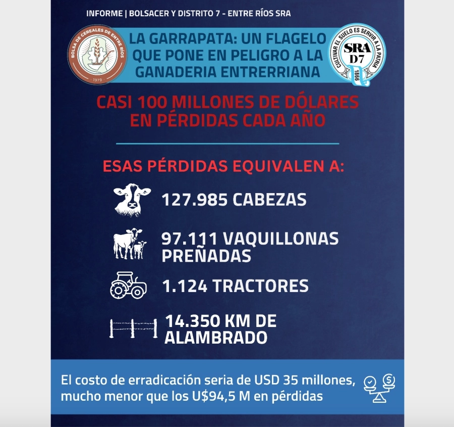 Un informe de la Bolsa de Cereales de Entre Ríos y la Sociedad Rural Argentina estimó que el ácaro podría afectar gravemente la producción bovina en siete departamentos de la provincia.