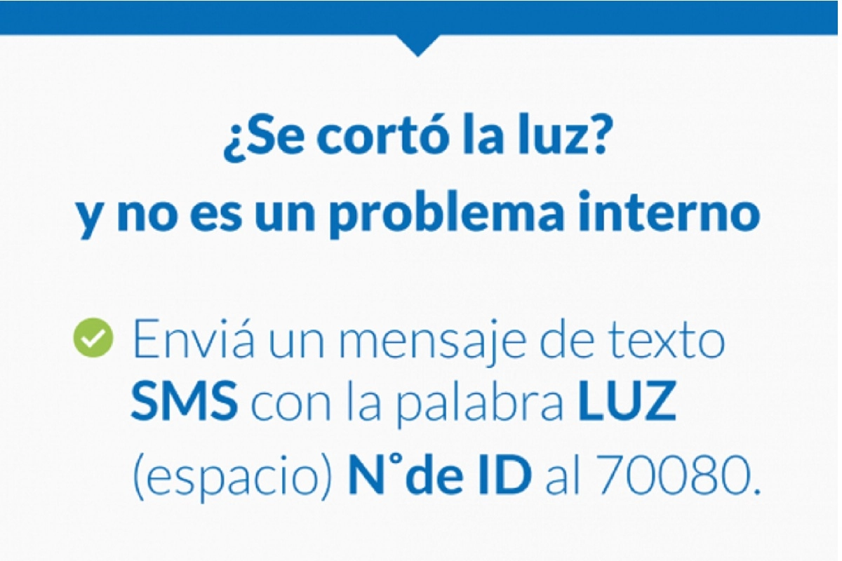 Ante la falta de suministro eléctrico, desde Enersa se recomienda enviar un mensaje de texto SMS con la palabra LUZ (espacio) número de ID al 70080 (el número de ID se encuentra en el extremo superior derecho de la factura).