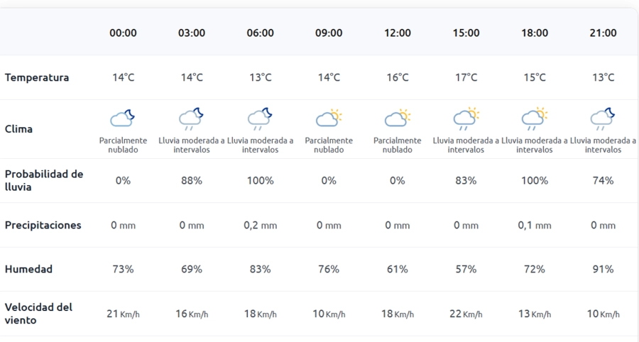 La tarde será el momento más crítico: se esperan lluvias moderadas a intervalos, con una máxima de 17° y ráfagas de viento que podrían superar los 22 km/h. Los chaparrones intermitentes obligarán a tener paraguas a mano y a extremar precauciones en la circulación.