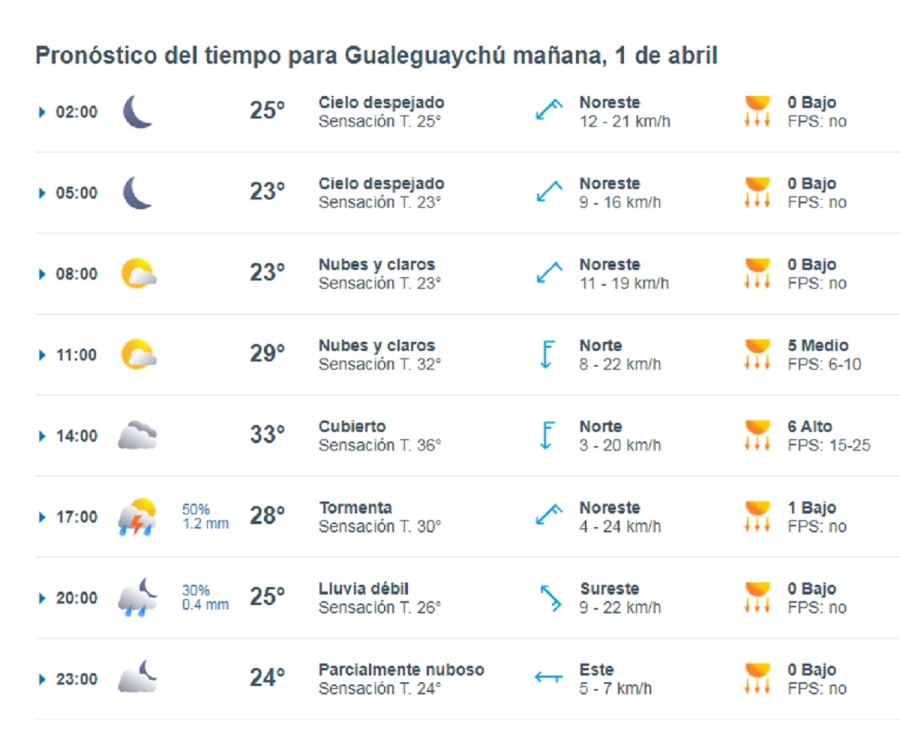 El pronóstico para este miércoles 1 de abril indica temperaturas máximas cercanas a los 33 °C y mínimas de 22 °C, acompañadas de una probabilidad de lluvia del 70%. Se esperan acumulados de hasta 13 milímetros, aunque no se descarta que en algunos sectores puedan registrarse valores superiores. Las ráfagas de viento podrían alcanzar los 29 km/h, generando complicaciones en zonas urbanas y rurales.