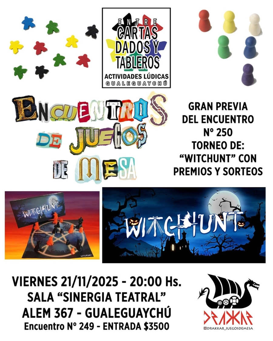 Vuelve el Encuentro de Juegos de Mesa con novedades nacionales. Sinergia renueva su propuesta lúdica, esta vez con un torneo de “Whitchunt”. Sumate a disfrutar una noche de juegos y encuentro con vecinos amigos y el mejor ambiente. Como siempre, habrá más de 200 juegos nacionales e internacionales para todos los gustos y edades.