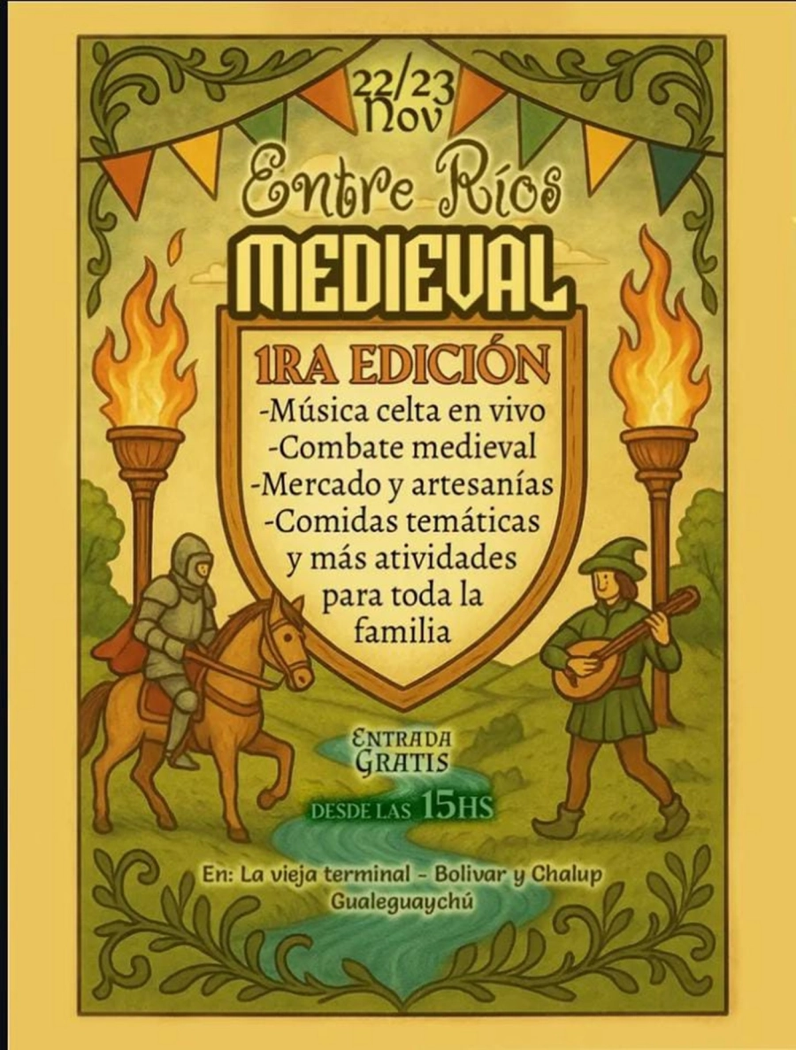 Gualeguaychú será sede del primer evento medieval de Entre Ríos. Durante el sábado 22 y el domingo 23 habrá una multitud de caballeros, vikingos, celtas, elfos, hadas, princesas, hechiceros, duendes, trovadores y mucho más. Más de 50 artesanos y recreacionistas se encargarán de dar color al mercado del medioevo. Además, las mejores bandas de música celta con trovadores, duetos y tríos repartidos en 2 escenarios. También habrá demostración de combate medieval a cargo de profesionales y soft combat para grandes y chicos. Para completar esta gran propuesta, habrá demostración de Arquería, lanzamiento de hachas, forja de armas y mucho más. ¡No te pierdas de esta experiencia increíble pensada para toda la familia!