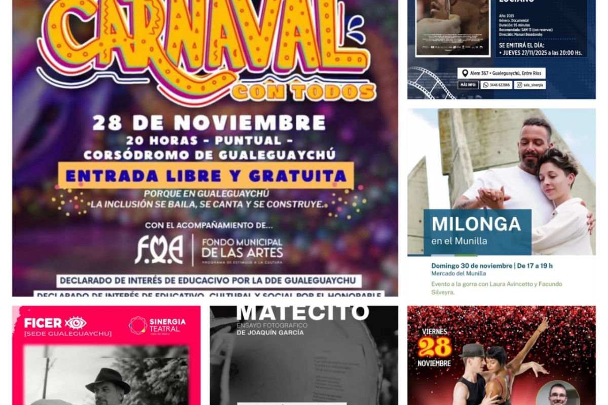 La movida cultural y artística de Gualeguaychú en un solo lugar. Conocé las propuestas para este fin de semana y los próximos días, agendá tu evento favorito y disfrutá del plan que mejor se adapte a tus gustos.