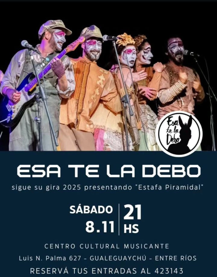 Esa Te La Debo llega a Gualeguaychú con su espectáculo “Estafa Piramidal”. La gira 2025 pasa por Entre Ríos y visitan el Centro Cultural Musicante. Habrá buffet con cosas ricas.