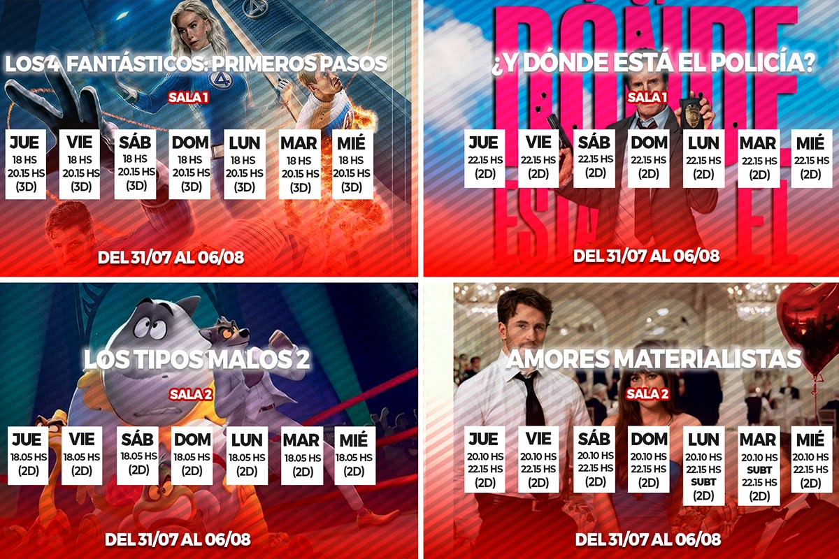 📅 Programación del 31 de julio al 6 de agosto. Llegan dos nuevas películas a la cartelera: ⭐ ¿Dónde está el policía? – Una comedia desopilante que te va a hacer reír de principio a fin 💔 Amores Materialistas – Un drama actual donde el amor y el dinero se ponen a prueba