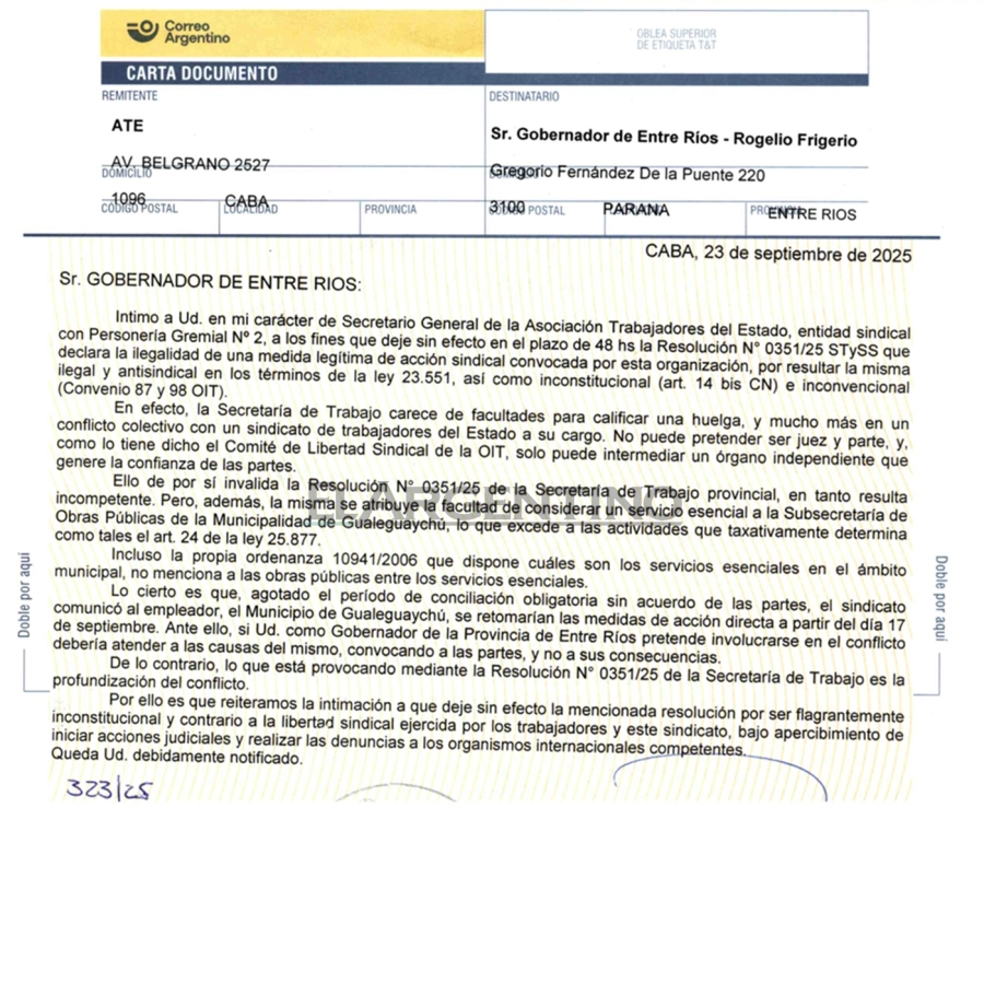 La Asociación Trabajadores del Estado (ATE) envió una carta documento al gobernador de Entre Ríos, en la que lo intima a dejar sin efecto, en un plazo de 48 horas, la Resolución N° 0351/25 de la Secretaría de Trabajo y Seguridad Social (STySS), que declaró ilegal una medida de fuerza