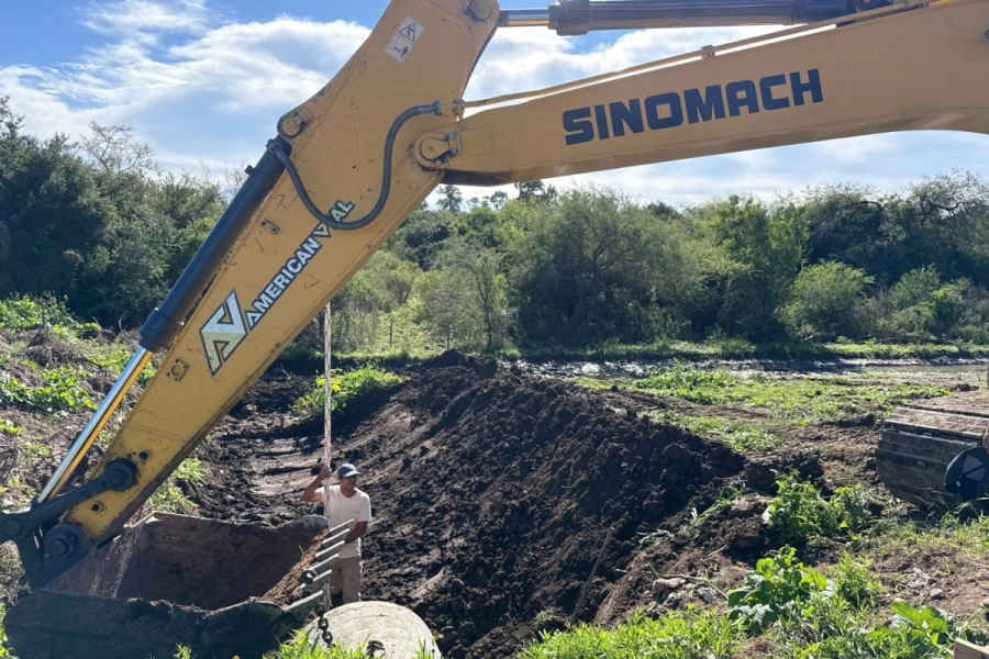 La envergadura de los caños —un metro de diámetro cada uno— permite dimensionar la capacidad del sistema para absorber los caudales pluviales provenientes del barrio San Isidro y las zonas adyacentes, con destino final el arroyo Gualeyán.