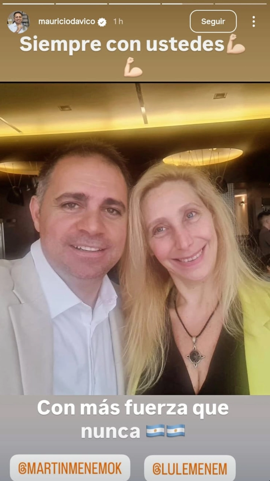 "Siempre con ustedes, con más fuerzas que nunca", escribió Davico etiquetando a Karina Milei, a Martín y a Lule Menem.