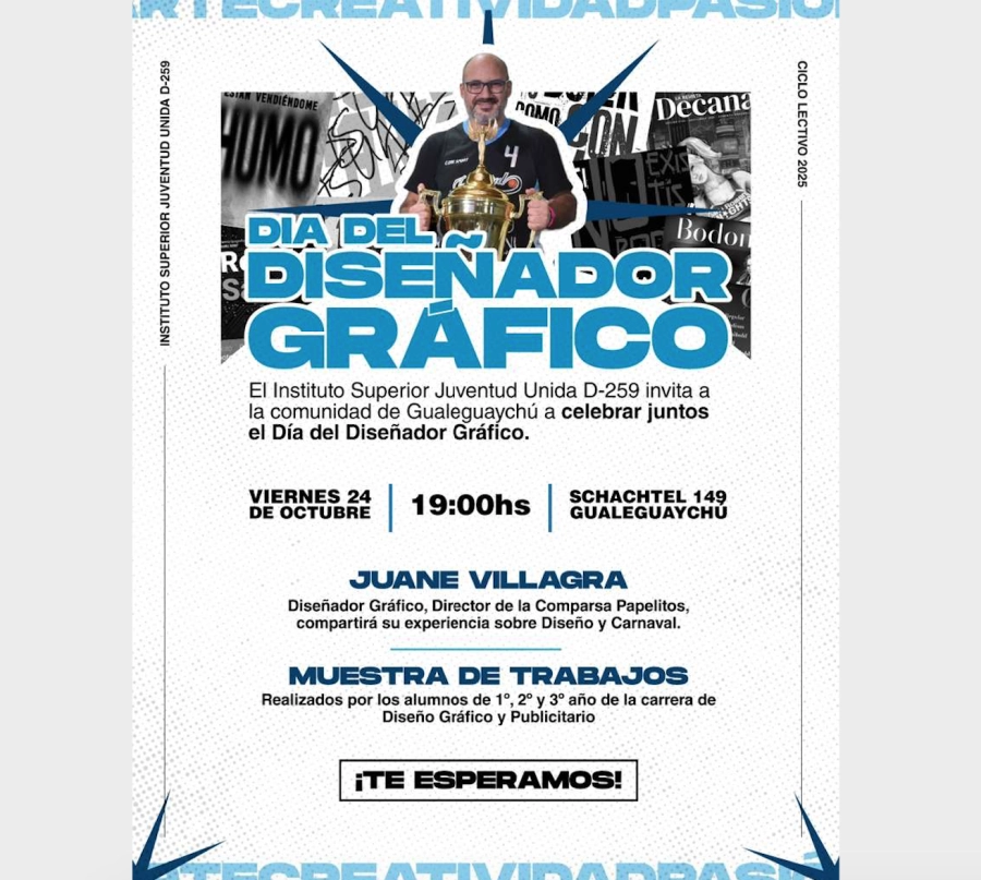 El Instituto Superior Juventud Unida D-259 invita a toda la comunidad a participar de la Muestra Anual de la Tecnicatura Superior en Diseño Gráfico y Publicitario, que se realizará el viernes 24 de octubre a las 19:00 h en Schachtel 149, Gualeguaychú.