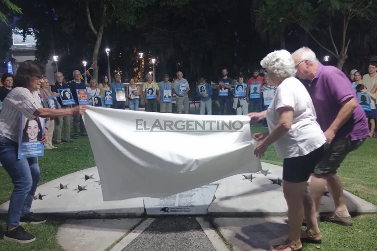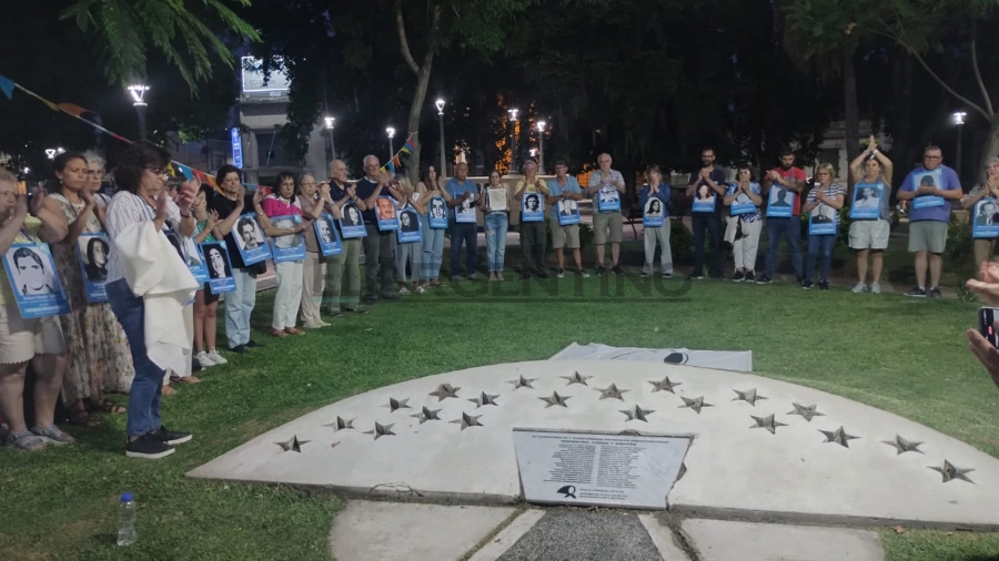El punto más esperado de la jornada llegó a las 20 horas, cuando fue descubierta la nueva placa situada en el ingreso a la plaza por calle Urquiza. El memorial, que había sido inaugurado en 2019 con 21 nombres, fue actualizado para incluir a las 37 personas desaparecidas de Gualeguaychú, luego del trabajo de reconstrucción histórica realizado por el Museo de la Memoria Popular “Osvaldo Delmonte”.