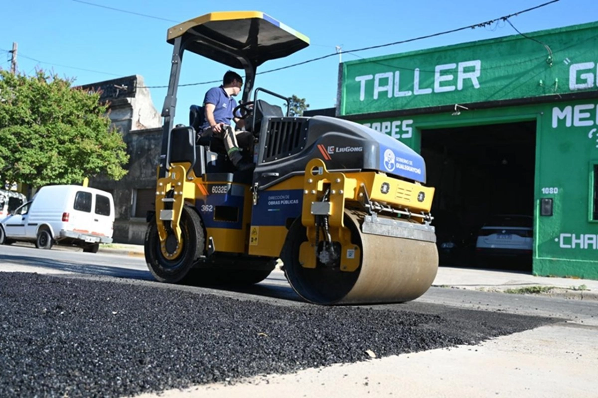 En los casos de bacheo asfáltico, la metodología es similar. Sobre la base de hormigón de limpieza, se colocan los últimos cinco centímetros con asfalto en frío. Aunque el material difiere del utilizado en los asfaltados de consorcios —donde se aplica mezcla en caliente—, el procedimiento técnico es equivalente: se distribuye la mezcla de manera manual o mediante maquinaria liviana, y posteriormente se compacta con un rodillo combinado. Este equipo, que cuenta con un cilindro metálico delantero y cuatro ruedas traseras, permite una compactación uniforme del material.
