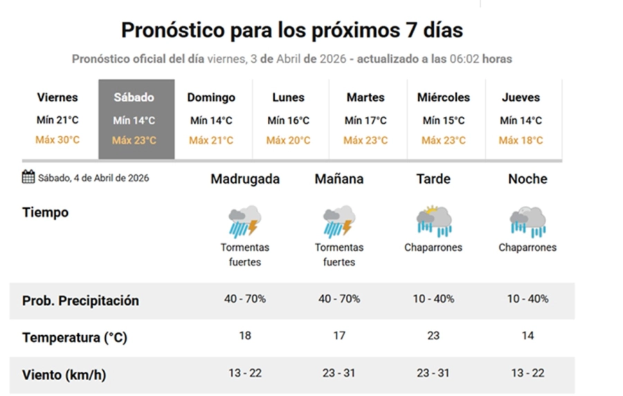 Si bien la probabilidad de lluvias para Gualeguaychú podría hacerse efectiva durante la tarde de este viernes, el alerta amarillo que emitió el Servicio Meteorológico Nacional es para la madrugada y mañana del sábado, y abarca también a los departamentos Paraná, La Paz, Diamante, Nogoyá, Villaguay, Victoria, Gualeguay, Colón, Tala, Uruguay e Islas del Ibicuy.