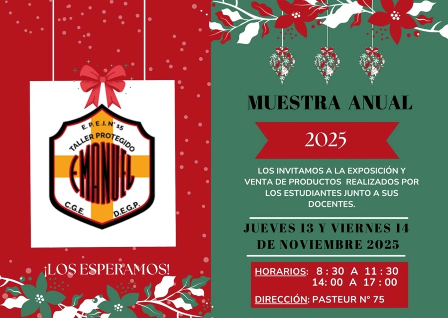 La muestra anual del Taller Protegido Emanuel se realizará en su sede, con entrada libre y gratuita. La comunidad está convocada a participar, recorrer los stands, conocer los proyectos y acompañar a los protagonistas de este espacio de inclusión y creatividad. Los días jueves 13 y viernes 14 de noviembre, desde las 8:30 horas por la mañana, hasta las 11:30 y por la tarde desde las 14:00 hasta las 17:00 horas. En calle Pasteur 75.