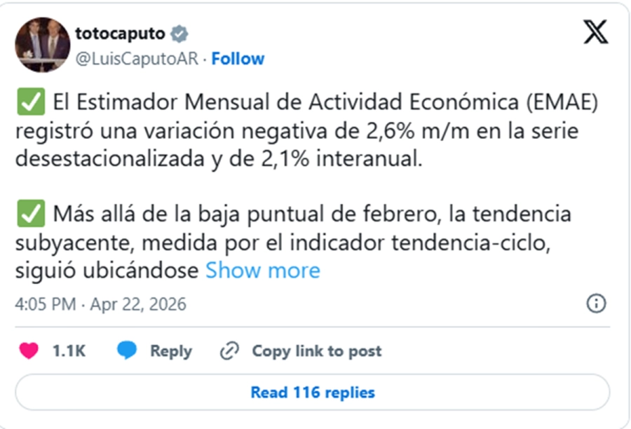 En ese sentido, el ministro de Economía Luis Caputo afirmó que, a pesar de la caída en febrero, la tendencia es “subyacente” y argumentó que el 2026 contó con dos días hábiles menos que el 2025, además de haberse registrado un paro general.