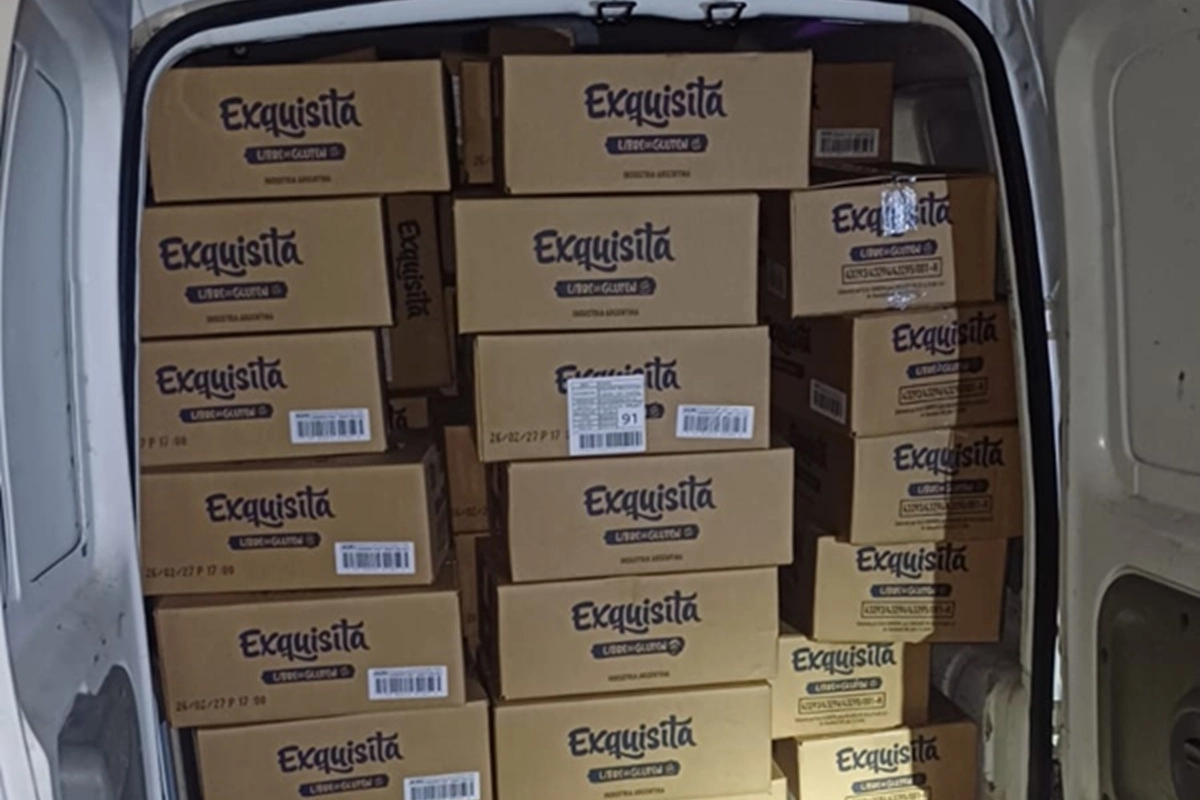 Por disposición del fiscal de turno se realizó la requisa del utilitario. Durante el procedimiento se secuestraron 106 cajas cerradas de bizcochuelo marca Exquisita, con 12 paquetes cada una, lo que suma un total de 1.272 unidades de mercadería, además del vehículo utilizado para el hecho.