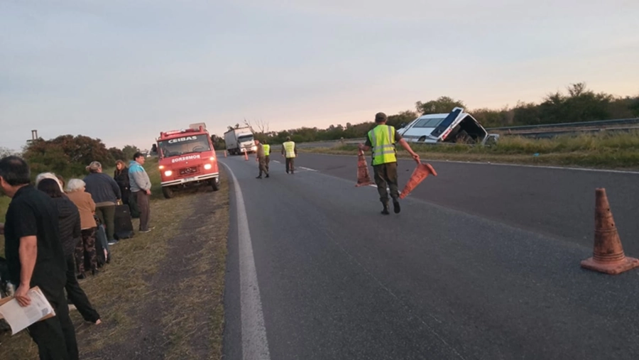 Una combi que trasladaba a 15 personas protagonizó un vuelco en la mañana de este martes en el kilómetro 159 de la Ruta Nacional 12. No hubo personas lesionadas de gravedad y se trabaja en la remoción del vehículo, con tránsito asistido.