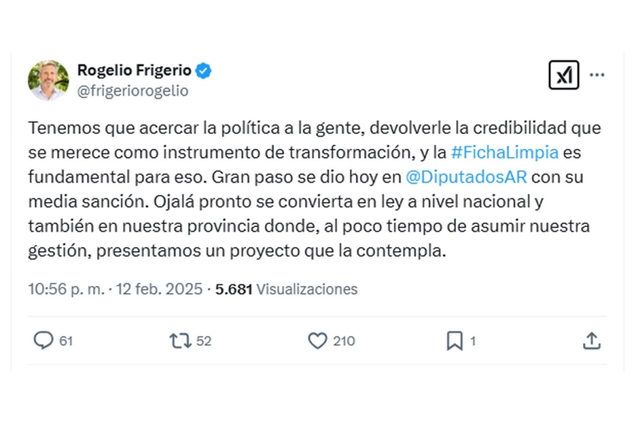A través de su cuenta en la red social X, Frigerio manifestó su apoyo a la normativa, que busca impedir que personas condenadas por corrupción y otros delitos puedan postularse a cargos públicos. “Tenemos que acercar la política a la gente, devolverle la credibilidad que se merece como instrumento de transformación, y la #FichaLimpia es fundamental para eso”, escribió el mandatario.