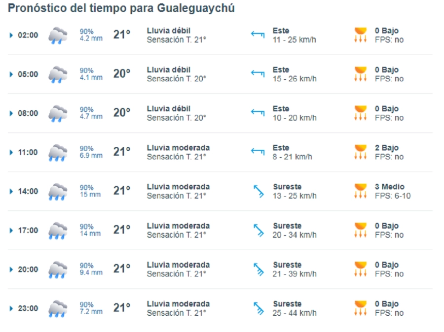 El SMN también emitió un aviso naranja por tormentas fuertes para la tarde de este miércoles, que abarca las mismas zonas de la provincia. En este caso, se esperan fenómenos más intensos, con acumulados de 80 a 180 milímetros, actividad eléctrica frecuente, posible granizo y ráfagas de hasta 90 km/h.
